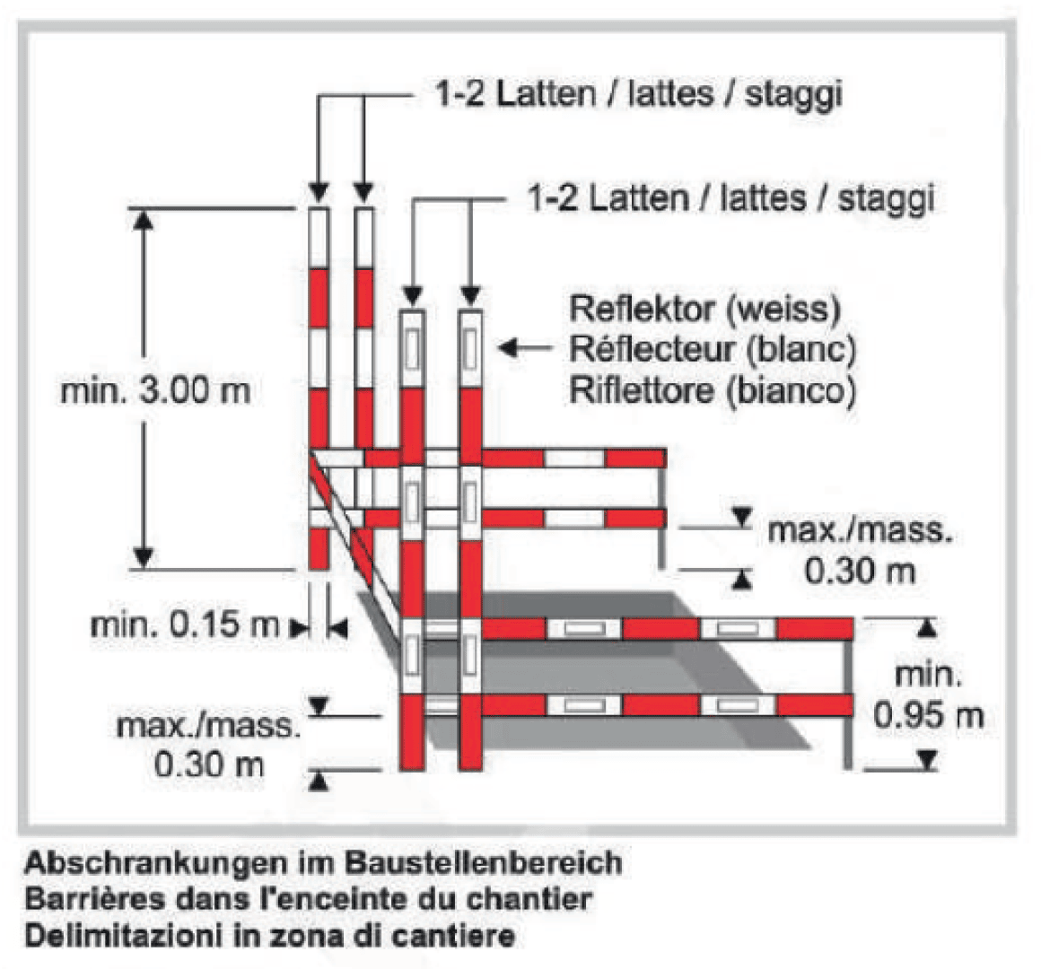 - Absperrlatten und Gitter: Für die physische Trennung von Verkehrs- und Arbeitsbereichen. Müssen rot-weiss markiert und mit reflektierenden Flächen versehen sein.