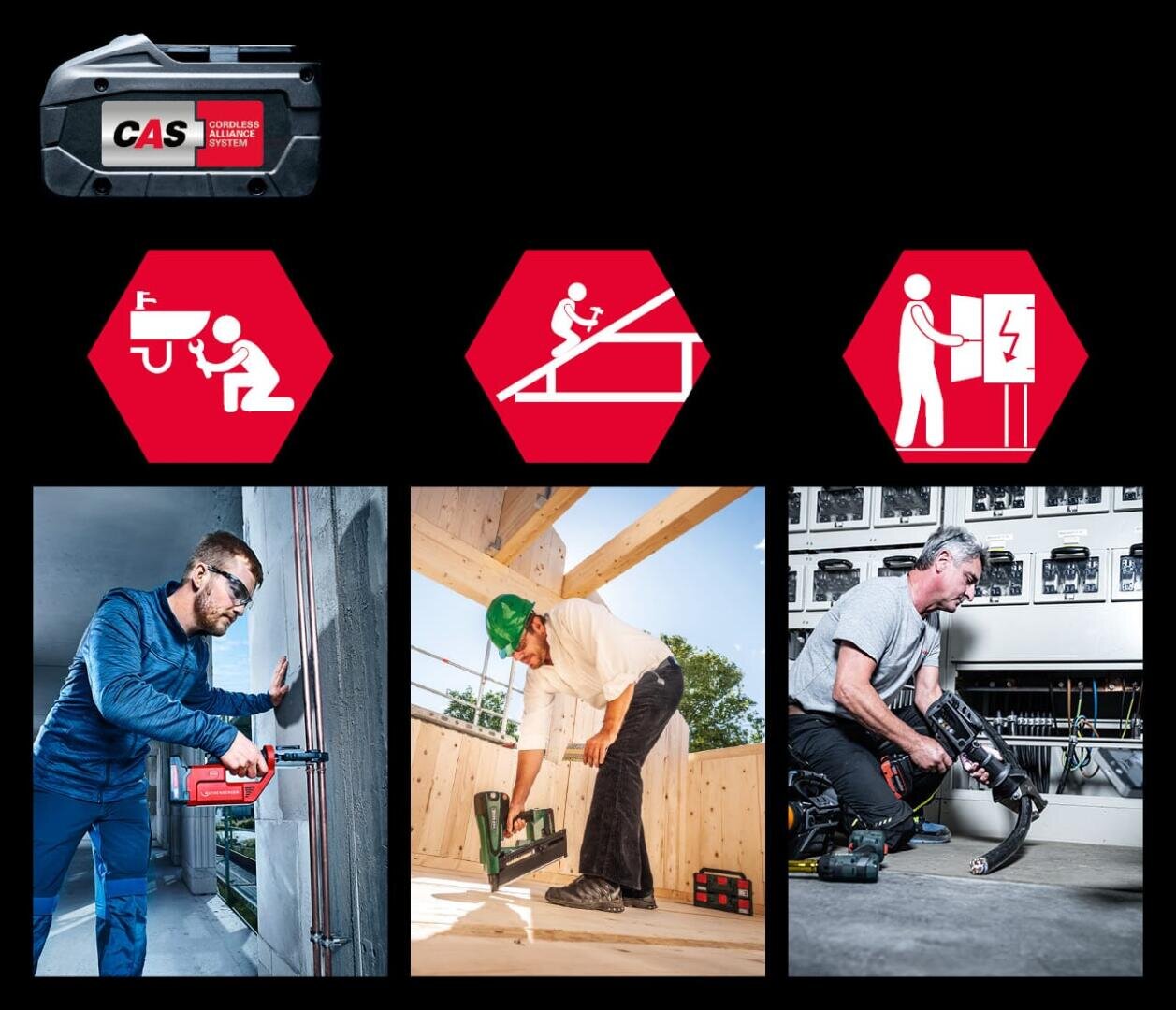 Für Profi-Anwender ist die Verwendung eines einheitlichen Systems für Akkupacks und Ladegeräte eine enorme Erleichterung. Mit CAS bietet sich die Gelegenheit, die unterschiedlichsten Werkzeuge aus einem herstellerübergreifendem Profi-Sortiment mit nur einem einzigen Akku-System zu nutzen.