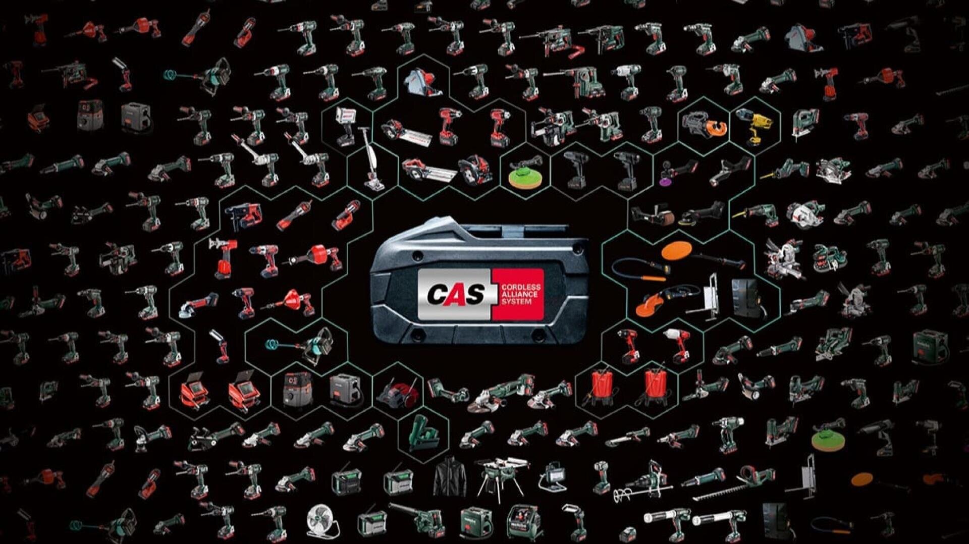 Das Cordless Alliance System (CAS) vereint als herstellerübergreifendes Akku-System 23 Marken und mehr als 200 Maschinen unter einem technischen Dach. Ein Akku und ein Ladegerät für alle gängigen Elektrowerkzeug-Typen und das mit weitem Abstand breiteste Angebot an Spezialmaschinen für Profis.